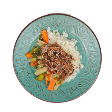 Vita slow cooked cu morcovi, ceapa, praz, telina si orez cu unt 500g
