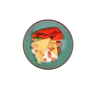-Mamaliga cu gorgonzola, bacon si ardei copt: faina de malai, ardei Kapia, otet, ulei de masline, gorgonzola, smantana vegetala, sare, piper, bacon.