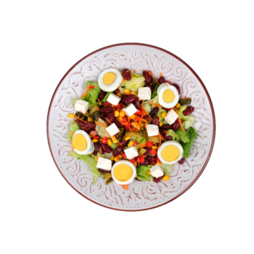 -Salata cu branza feta, ardei copti si fasole boabe: mix de salata, fasole boabe, ardei copti, branza feta, castravete mutat, ou, morcov, ulei de masline, sos pesto roso.