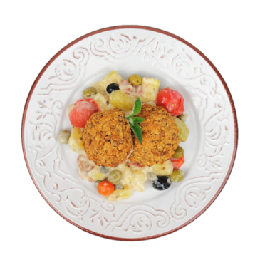 Chiftelute de linte si bulgur cu sote de cartofi cu dovlecel, rosii cherry, rosii uscate, masline si capere la cuptor 250g