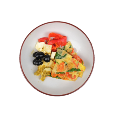 Fritata cu ardei, rosii cherry si baby spanac cu salata de anghinare, ardei kapia copt, masline, branza de capra si pesto rosso 200g