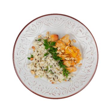 -Thai mango chicken cu caju si orez salbatic cu lime: piept de pui, orez, sare, piper, curry, nucsoara, lamaie, ceapa, morcovi, usturoi, mango, coriandru, boia, lime, ulei de masline, tumeric, patrunjel, caju.